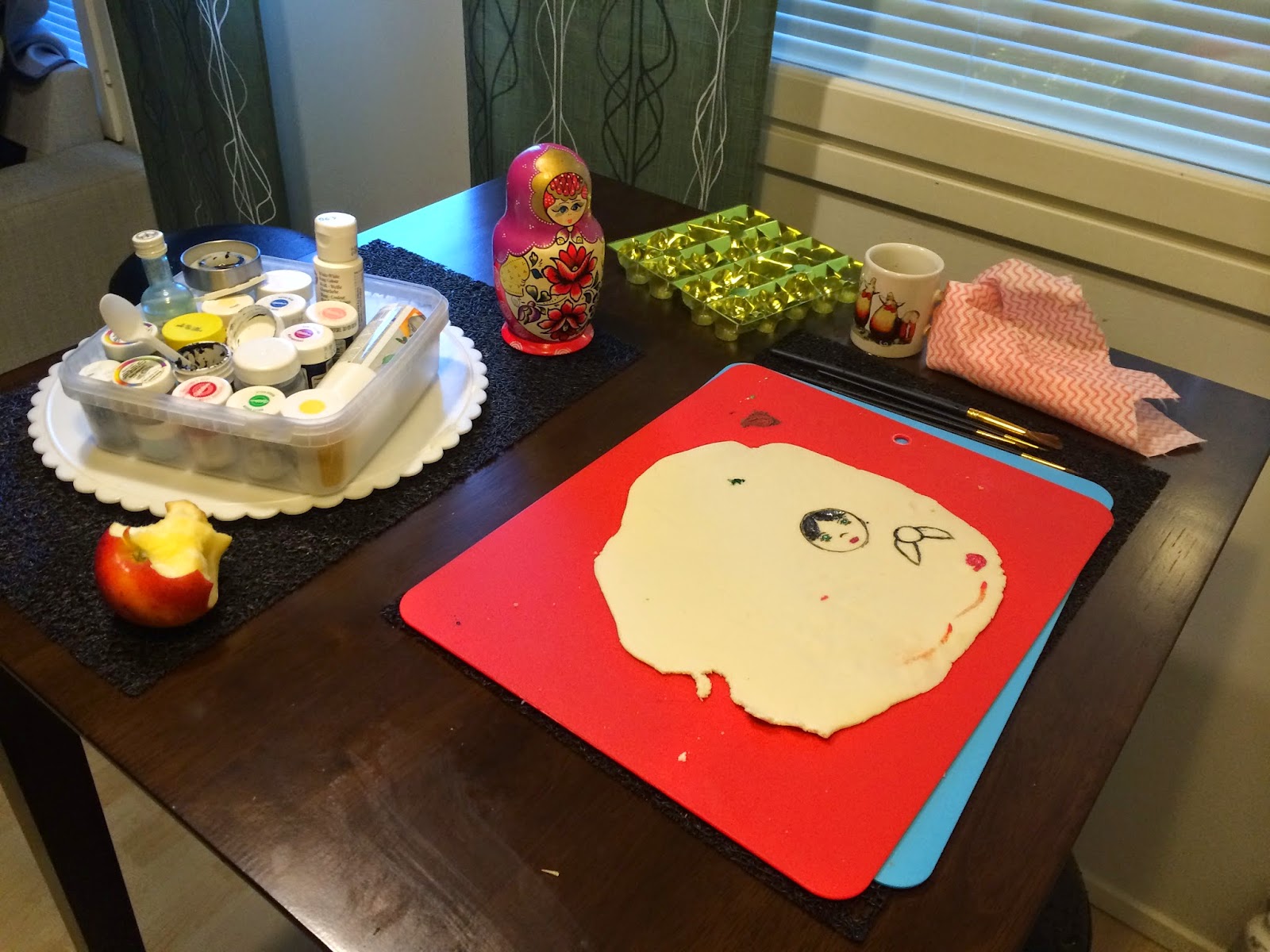 After carving and shaping the cake, a layer of buttercream crumbcoat helped it to get a much better and neat doll shape. Time to put it to rest for next day. Day number two was all covering in fondant, and painting details